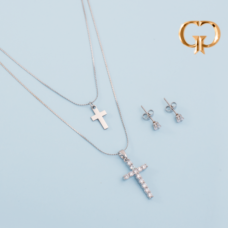 J1424 - JUEGO ACERO CADENA 2 VUELTAS CRUZ EN MICROZIRCONES,
