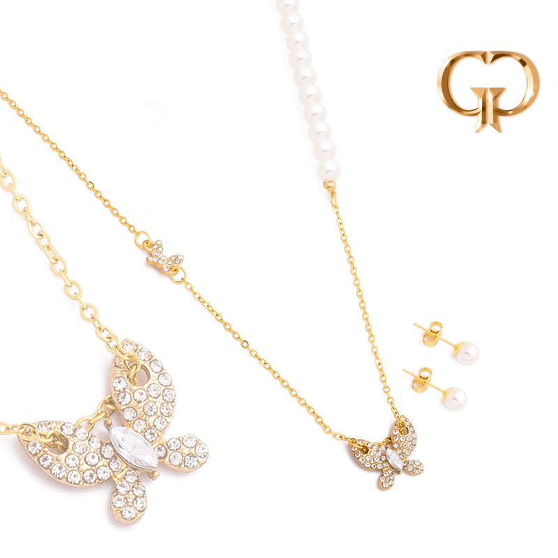 JUEGO ACERO PERLAS Y MARIPOSAS EN MICROZIRCONES