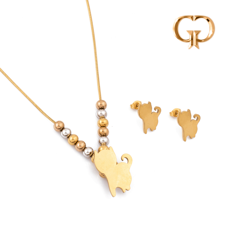 J877 - JUEGO ACERO GATO BALINES 3 TONOS CADENA COLA DE ZORRO