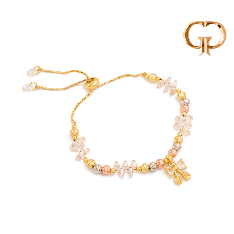 PULSERA BOLAS 3 TONOS Y MURANOS DIJE MOÑO EN ZIRCONES AJUSTABLE, COVER GOLD