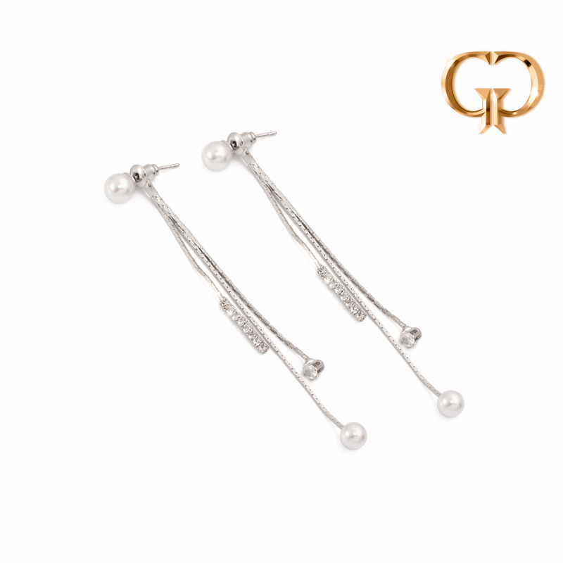 ARETE LARGO PERLA Y TIRAS , RODIO