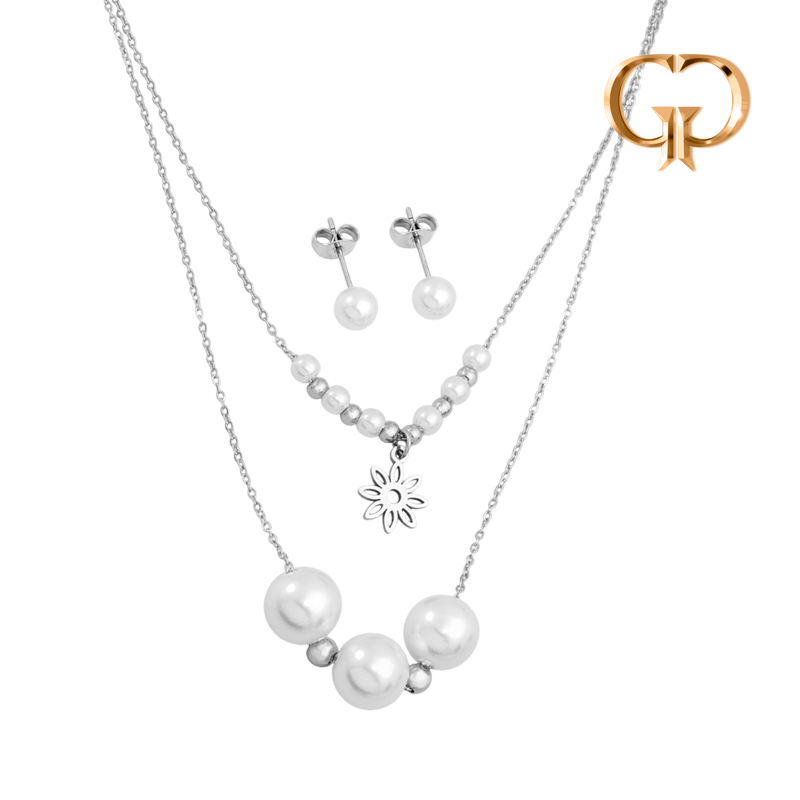 JUEGO ACERO PERLAS Y FLOR CADENA 2 VUELTAS