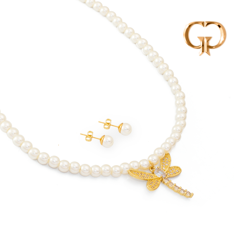 JUEGO LIBELULA EN MICROZIRCONES , PERLAS + PULSERA , COVER GOLD