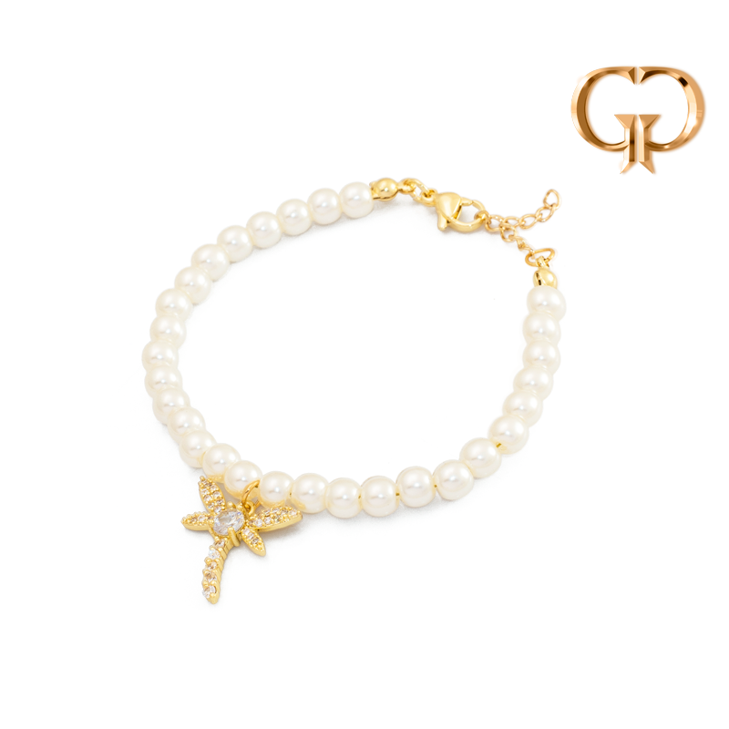 PULSERA LIBELULA EN MICROZIRCONES , PERLAS + PULSERA , COVER GOLD