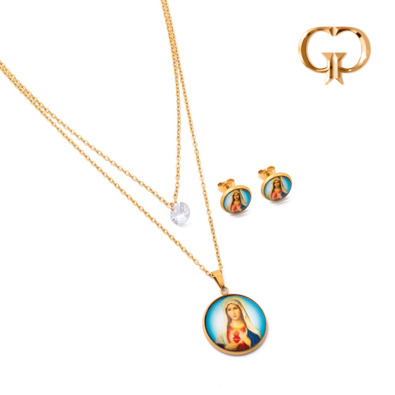 JUEGO ACERO VIRGEN DEL INMACULADO CORAZON ZIRCON CADENA 2 VUELTAS