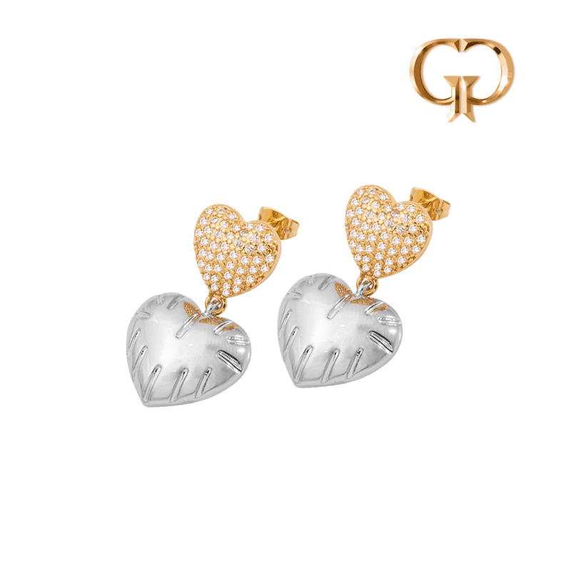 ARETE BICOLOR CORAZON DE FUEGO MICROZIRCONES Y LISO DECORADO , RODIO