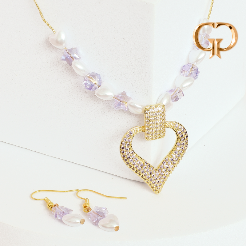 J1384 - JUEGO CORAZON GRANDE ECUALIZABLE EN MICROZIRCONES, ESTRELLAS EN CRISTAL LILA Y PERLAS CORAZON, GOLD FILLED