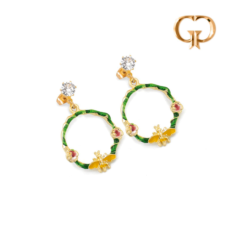 Z219 - ARETE TOPO ZIRCON CIRCULO FLORES Y ABEJA LAMINADO ORO